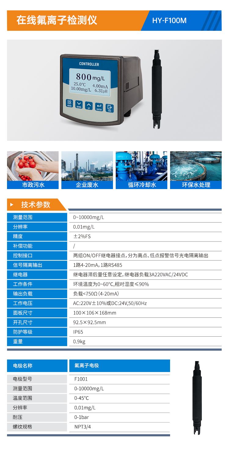 氟离子在线测控仪采用美国进口先进的氟离子选择电极法(ISE法),灵敏度高,信号响应迅速,测量准确、性能稳定、维护简单。该测控系统具有使用方便、准确度高、经济的特点。运用这一系列先进的分析技术,确保仪器长期工作的稳定可靠性和准确性。具有中文菜单式操作、485通讯等功能。用于饮用水处理厂、罐装厂、饮用水分布网、水质处理工程等对水溶液中的氟离子含量进行连续监测和控制。- 产品特点
