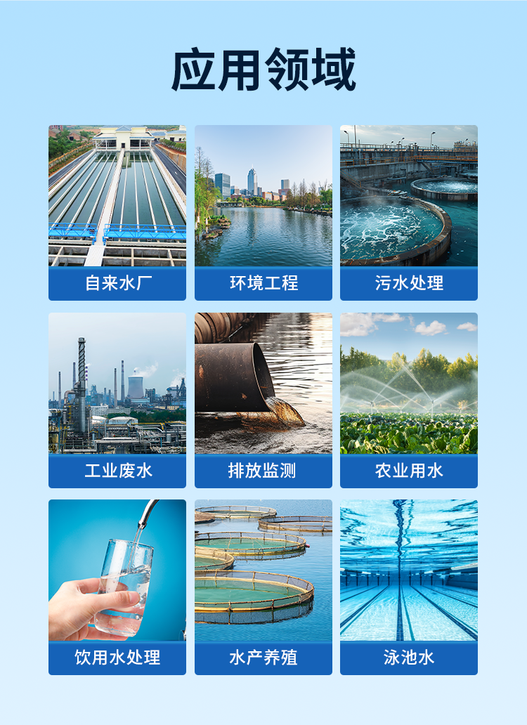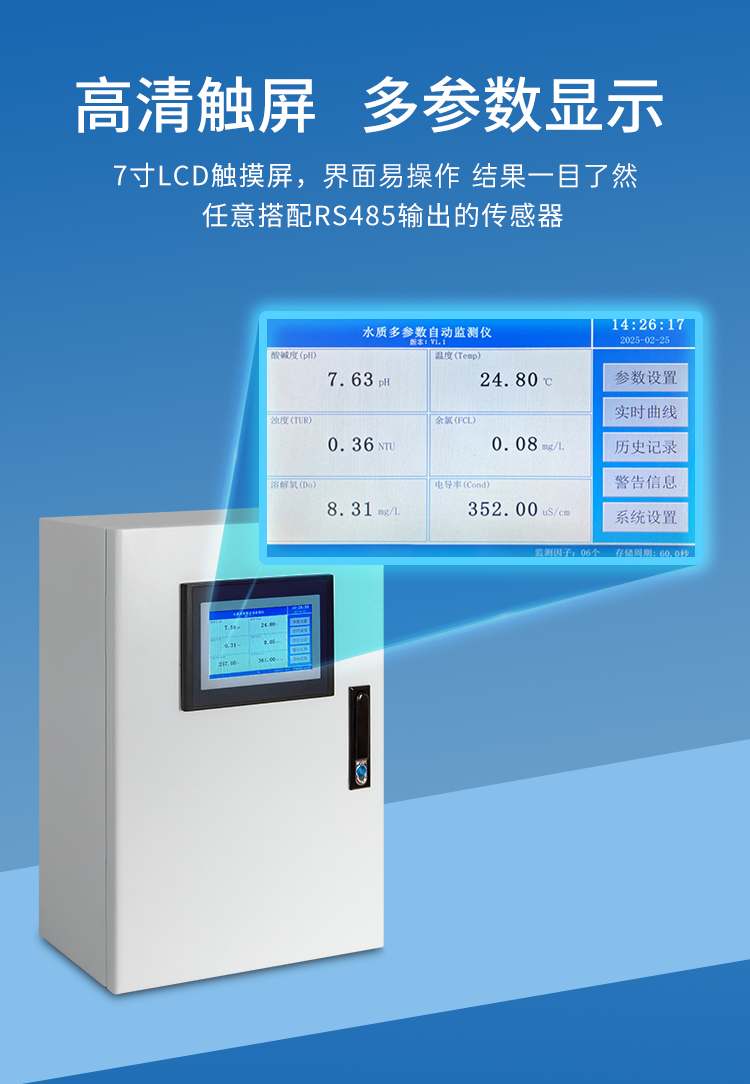 本产品可同时测量多种参数,7寸高清显示屏,不仅可以查看实时监测参数,还能查看运行曲线、 历史数据等。也可接入报警系统,作为泳池饮用水、养殖等监测设备。 本产品根据不同客户需求,可选择匹配电极检测多种参数,例如检测PH、余氯、电导率、浊度等参数,广泛应用于自来水、饮用水、泳池水、农业、养殖、工业废水、环保等多种不同需求的领域。