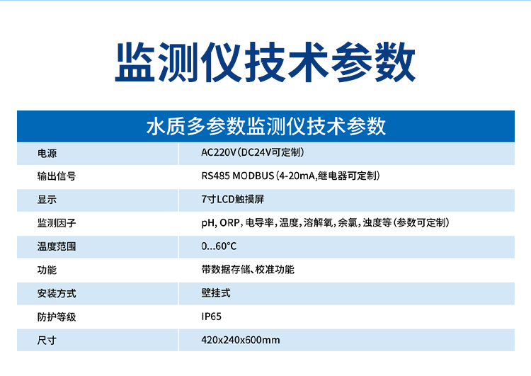 技术参数 常规检测项目 余氯、浊度、PH、ORP、电导率、溶解氧、温度(参数可定制) 输出信号 RS485 MODBUS(4-20mA,继电器可定制) 工作环境温度 0~+70℃ 仪表储存温度 -20~+70℃ 显示 7寸LCD触摸屏 功能 带数据储存,校准功能 防护等级 IP65 电源 AC220V(DC24V可定制) 安装方式 壁挂式 尺寸 420*240*600mm