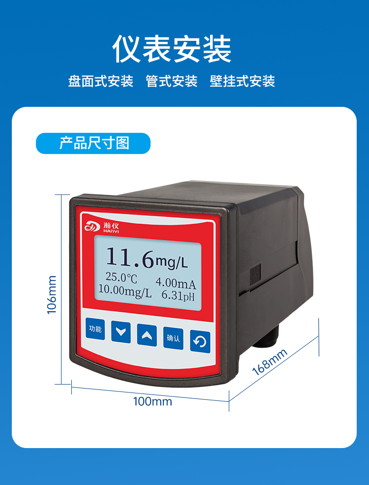 温度:0-60°℃分辨率 0.001mg/L,0.01mg/L,0.01pH,0.1°C 精度 优于±2%或±0.02mg/L,±2%或±0.02mg/L,±0.05pH,±0.5℃ 温度补偿 手动/自动PH补偿功能(0-14)和温度补偿功能(0-60°C) 控制接口 两组ON/OFF继电器接点,分为高点、低点报警信号光电隔离输出 信号隔离输出 1路4-20mA,1路RS485 继电器 继电器滞后量任意设定,继电器负载3A220VAC/24VDC 工作条件 环境温度为0~60℃,相对湿度≤90% 输出负载 负载<750Q(4-20mA) 工作电压 AC:220V±10%或DC:24V,50/60Hz 面板尺寸 100×106×168mm 开孔尺寸 92.5×92.5mm 防护等级 IP65 重量 0.9Kg