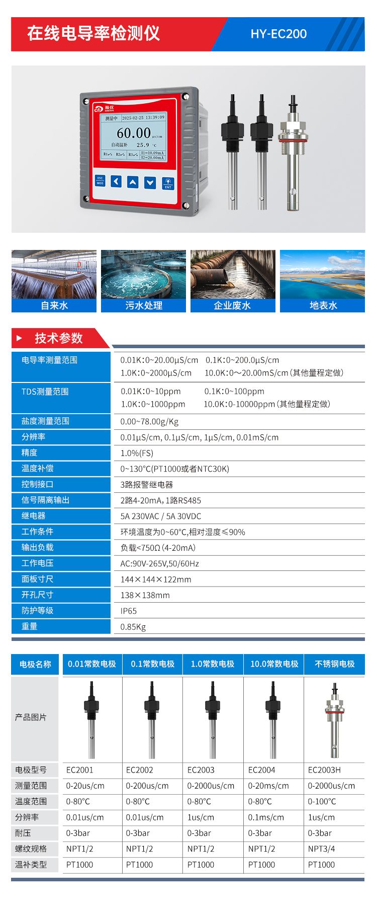 项目 详细参数 电导率测量范围 0.01K:0~20.00μS/cm;0.1K:0~200.0μS/cm